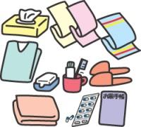 日用品 | (1)洗面用具 (2)ティッシューペーパー (3)スリッパ (4)お箸・湯呑み (5)寝巻き・パジャマ (6)タオル (7)下着 |