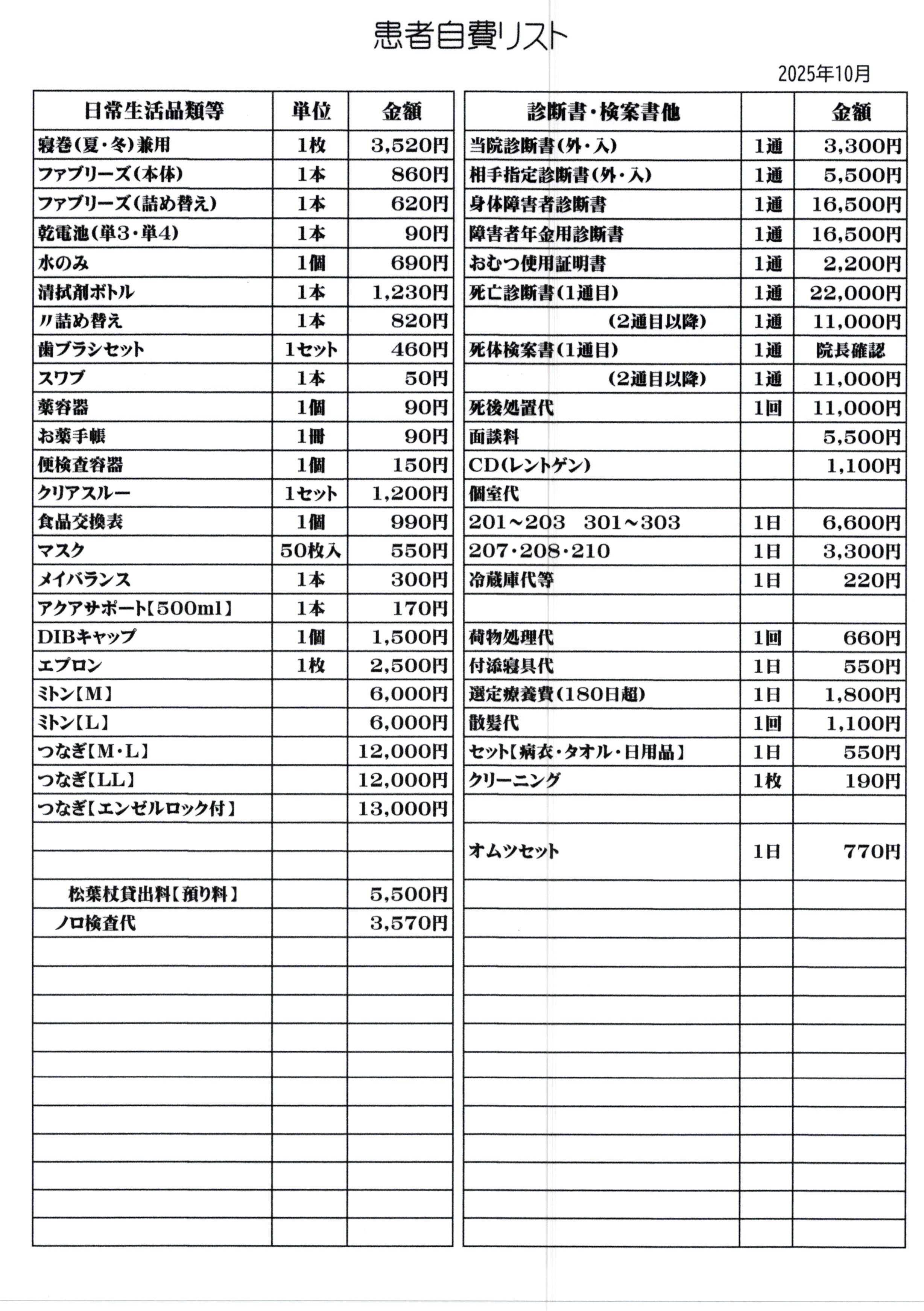 ※入院期間が180日を超える入院 入院医療の必要性が低い患者様の事業により180日を超えて 入院【難病患者等に入院診療加算を算定する患者を除く】する患者様については、180日を超えた日以降の 入院料及びその療養に伴う世話その他看護に係る料金として、下記の金額を徴収します。 1日につき 1,800円 |